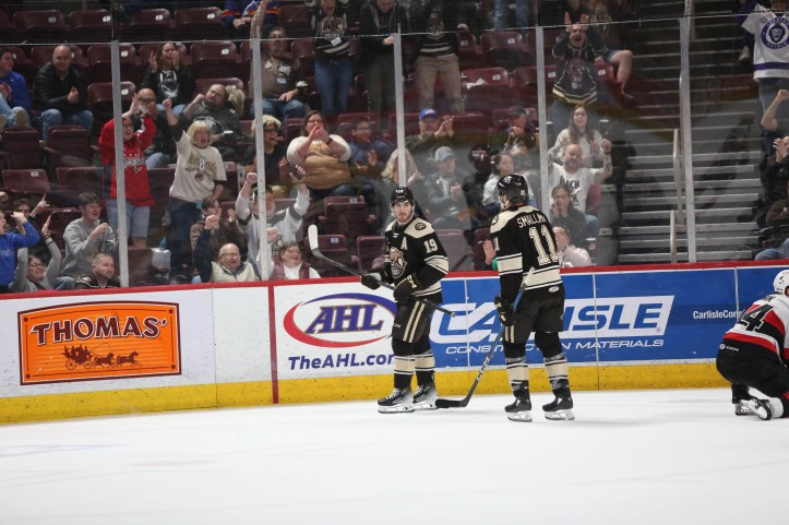 Then seven minutes later, Spencer Smallman, celebrating a new deal that will keep him in the organization for another two year, tipped home his tenth of the season, which put Hershey up 2-0.